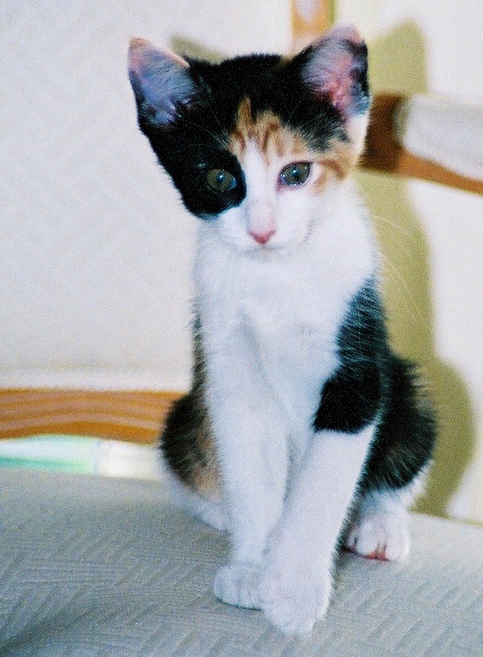 Two years ago, a very pregnant calico cat followed my indoor-outdoor cat, Potter, to the food bowl on my front porch. She was very shy from the beginning, and would come to the bowl only when I went inside.